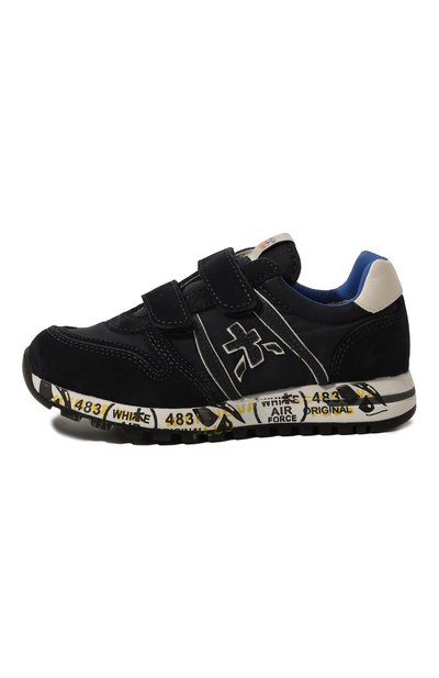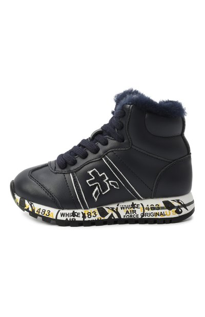 Темно-синие высокие кроссовки обеспечат комфорт на прогулке в холодную погоду. Чтобы обувь поддерживала оптимальный микроклимат, внутри предусмотрели отделку из мягкой густой овчины. Модель с боковой молнией выполнили из гладкой плотной кожи. Пару украсили нашивками в форме знаковых иероглифов и принтом, имитирующим печати и штампы.