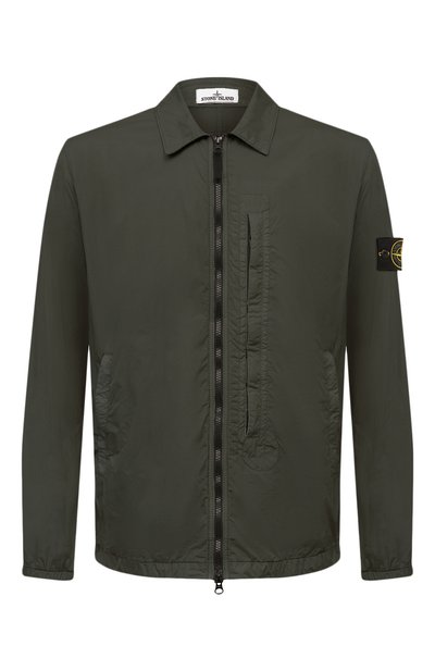 Куртку с отложным воротником, как у рубашки, сшили из прочного нейлонового репса. На внутреннюю сторону материала нанесли полимерное покрытие, поэтому модель не продувается ветром и не промокает под дождем. За счет дополнительной обработки смолой при окрашивании вещи в готовом виде пигмент проник неравномерно, сформировав немного неоднородный темно-зеленый цвет. Изделие с боковыми карманами, застегивающееся встречной молнией, украсили съемным брендированным патчем.
