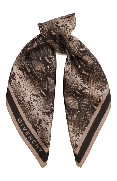 Коричневый платок выполнили из тонкого шелкового твила с принтом, имитирующим кожу змеи. Цветовую гамму анималистичного узора повторяет широкий брендированный кант. Такой аксессуар поможет поставить деликатный акцент в лаконичном образе.