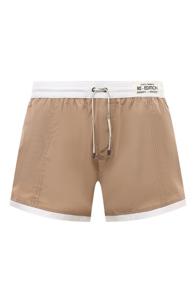 Для пошива темно-бежевых плавок-шортов использовали шелковистый тонкий полиэстер, который не теряет форму со временем и быстро сохнет. Посадку можно регулировать белым широким поясом-кулиской, цвет которого поддержали лампасами и кантом по краям брючин.