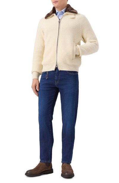 Молочно-белый кардиган с длинными рукавами и высокой эластичной горловиной украшен спереди рельефными узорами, имитирующими плетение. Однотонная прямая модель из мягкой премиальной шерсти мериноса, хорошо сохраняющей тепло, застегивается молнией. Предлагаем создать комфортный повседневный образ с синими джинсами и коричневыми пенни-лоферами.
