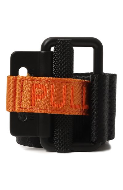 Черный ремень изготовили из фактурного плотного текстиля с жаккардовым логотипом марки. Надпись на материале выполнили в тон, подчеркнув ее лишь рельефом. Рядом с пряжкой модель дополнили белой брендированной нашивкой и ярко-оранжевой вставкой.