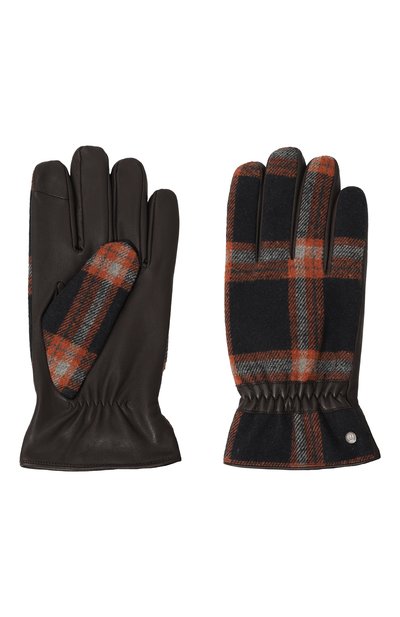 Черные перчатки выполнили из комбинации мягкого плотного текстиля в клетку и тщательно выделанной кожи с зернистой фактурой. Принадлежность модели марке обозначили серебристой миниатюрной деталью с выгравированной эмблемой бренда. Эластичные вставки комфортно облегают запястья и не позволяют аксессуару сползать.