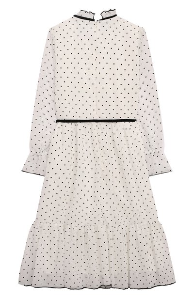 Кремовое платье с подкладом из мягкого хлопка выполнили из тонкого тюля с красным гороховым узором. Его цвет поддерживают как пуговицы, так и объемный бант, которым декорировали отложной воротник. Длинные рукава и расклешенный многоярусный подол подчеркнули воздушными рюшами.