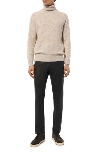 Накладные карманы по бокам сделали темно-серые классические брюки со стрелками немного непринужденнее. Для пошива модели использовали мягкую тонкую шерсть, которая долго будет выглядеть безупречно. Пояс дополнили резинкой, позволяющей обойтись без ремня, а брючины сзади заузили эластичными манжетами.