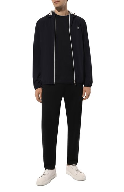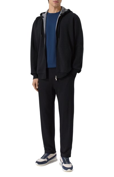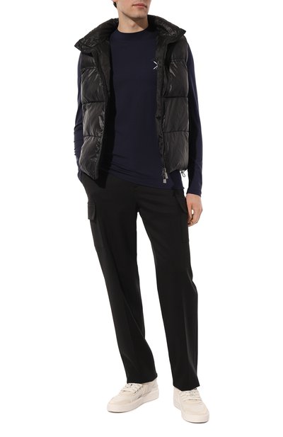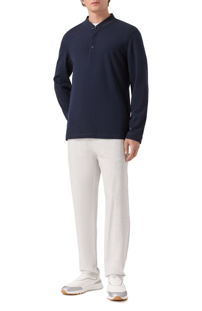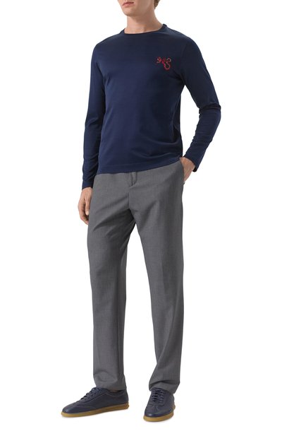 В основе темно-синего лонгслива лежит комфорт, которого добились сочетанием детально проработанного кроя и материала. Привычному хлопковому джерси предпочли нежнейший шелковый трикотаж, исключительно приятно ощущающийся на коже. Идеально гладкая поверхность полотна и его легкий блеск выгодно подсветили миниатюрную накладку в виде эмблемы бренда. Манжету на левом рукаве деликатно подчеркнули изображением итальянского флага.