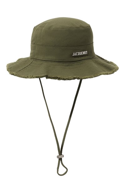 Панама из плотной хлопковой ткани выглядит так, словно пережила уже не одну экспедицию. Такое впечатление Симон Порт Жакмюс задал необработанными краями широких полей. На тулье дизайнер предусмотрел кулиску со шнуром и фиксатором, а еще один фиксатор расположил на длинном ремешке, будто позаимствованном у ковбойской шляпы.
