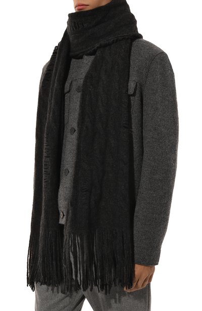 Шарф с бахромой по кр аям выполнен из мягкой ворсовой шерсти. Однотонный аксессуар украшен патчем с логотипом марки. Длины изделия хватит, чтобы дважды обернуть его вокруг шеи или завязать сложным узлом.