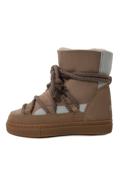 Для пошива бежевых сапог использовали бархатистую замшу, а мыс, боковые панели и задник укрепили накладками из плотной кожи, поэтому обувь меньше боится грязи и мокрого снега. Внутреннюю отделку выполнили из густо набитой овчины, хорошо сохраняющей тепло даже в сильные морозы. Пару на плоской нескользящей подошве из пе реработанной резины, как у кедов, дополнили высокой шнуровкой.