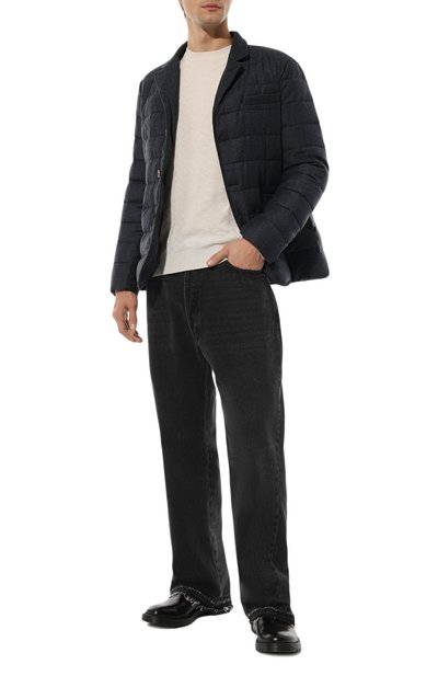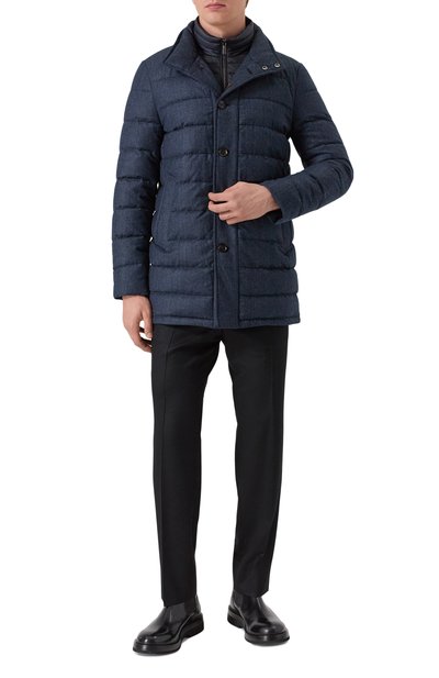 Синяя куртка, стилизованная под однобортный пиджак с воротником-стойкой, идеально сочетается как с классическими брюками, так и с джинсами. Для пошива стеганой утепленной модели использовали мягкий легкий кашемир, который хорошо согревает и не теряет внешний вид в течение долгого времени.