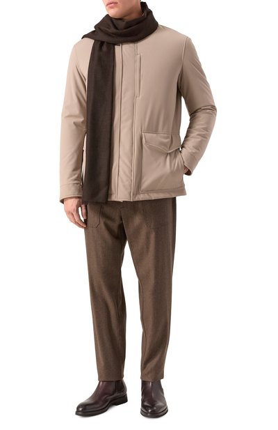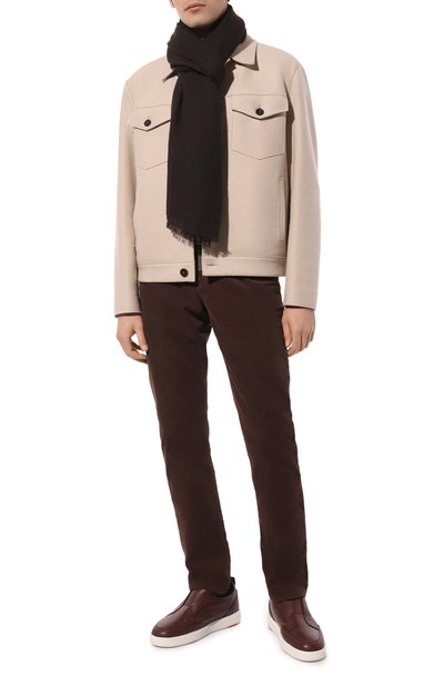 Коричневый клетчатый шарф выполнили из мягкого нежного кашемира. Исключительно приятный на ощупь материал обладает терморегулирующими свойствами, поэтому аксессуар согреет в мороз, но в нем не будет жарко в оттепель. Длины модели с бахромой по краям хватит, чтобы завязать французский узел.