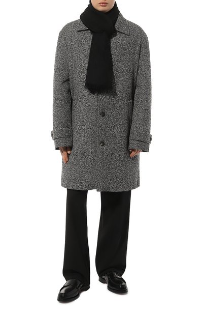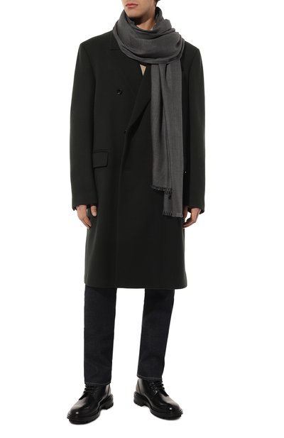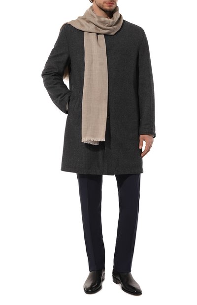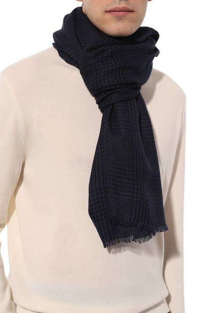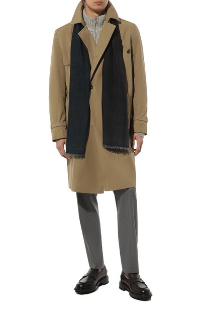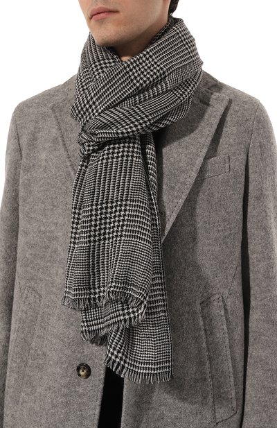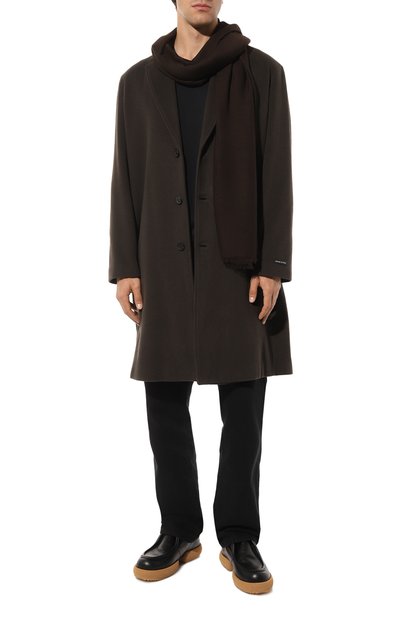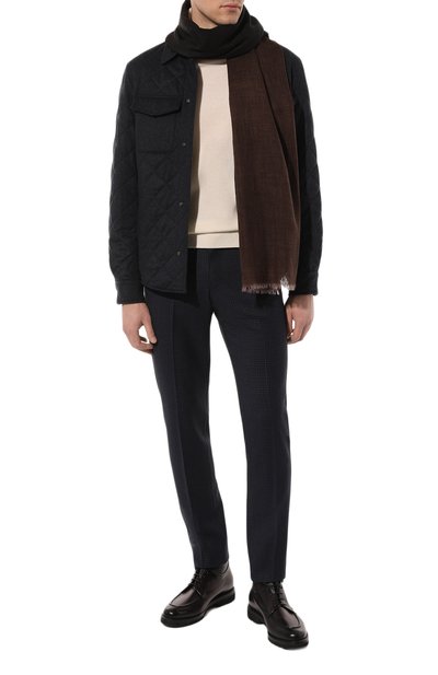 Коричневый клетчатый шарф выполнили из мягкого нежного кашемира. Исключительно приятный на ощупь материал обладает терморегулирующими свойствами, поэтому аксессуар согреет в мороз, но в нем не будет жарко в оттепель. Длины модели с бахромой по краям хватит, чтобы завязать французский узел.