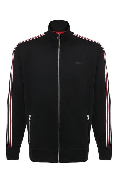 Черную олимпийку мастера марки, основанной Хуго Фердинандом Боссом, сшили из эластичного трикотажа на базе прочного шелковистого полиэстера с добавлением мягкого хлопка. Дышащий материал оптимально тянется, обеспечивая свободу движений, а после стирок не теряет безупречный вид. Модель декорировали миниатюрным логотипом в тон спереди и широкими полосатыми лентами на рукавах.