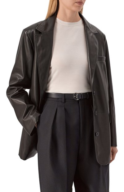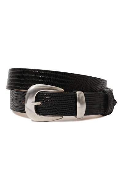 Для изготовления черного ремня использовали прочную кожу с тиснением под ящерицу. Блестящее лаковое покрытие на материале защищает его от царапин и акцентирует внимание на фактурном узоре. Аксессуар застегивается крупной пряжкой из полированного металла цвета старинного серебра.