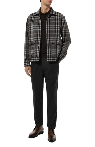 При создании коричневых ботинок с миндалевидным мысом использовали мягкую кожу двух фактур: гладкую и оленью с характерным крупным зернением. Мастера марки, основанной Джоном Ричардсоном Барреттом, вручную окрашивали и полировали модель, чтобы сформировать патину, как у винтажной обуви. Сбоку предусмотрели молнию, поэтому пару с высокой шнуровкой удобно надевать и снимать.