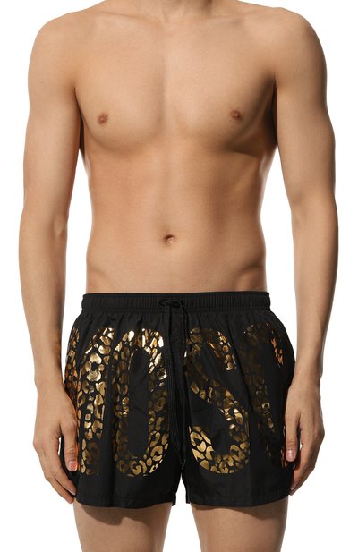Для пошива черных плавок-шортов использовали шелковистый быстросохнущий текстиль с паттерном в виде золотистых шипов-пирамид. Крой модели сделали свободным, поэтому она не сковывает движения во время активных заплывов или игр на пляже. Чтобы изделие не слетало при сильной волне, его дополнили широким регулируемым поясом-кулиской, украшенным крупной эмблемой.