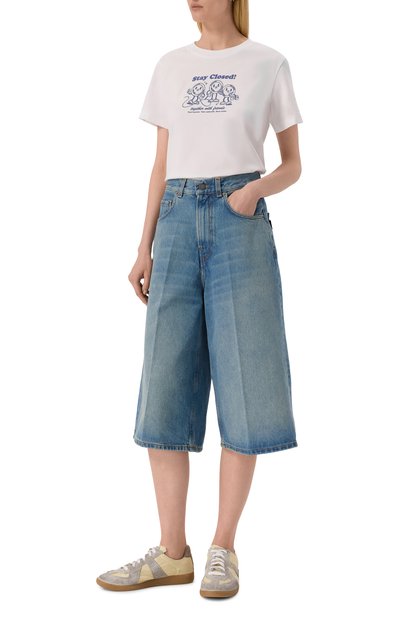 Белая футболка громко заявляет о своей принадлежности бренду при помощи бархатистого на ощупь и слегка видоизмененного логотипа. Для пошива модели использовали тонкое дышащее джерси из органического хлопка. Производство такого материала позволяет сократить вредное воздействие на почву и сэкономить ресурсы.