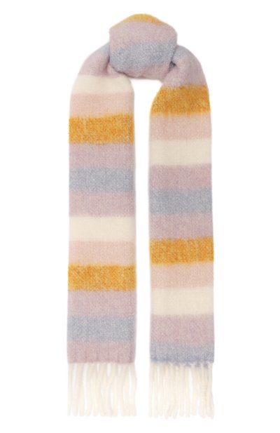 Полосатый разноцветный шарф связали из пушистой пряжи на основе тонкой нежной шерсти. Материал не колется и отлично сохраняет тепло, а благодаря добавленным в состав волокнам полиамида он не подвержен пилингу и не вытягивается. Длины модели с бахромой на концах хватит, чтобы пару раз обернуть вокруг шеи.