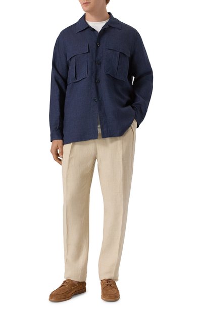Темно-синюю рубашку с отложным воротником и фигурным низом сшили из мягкого тонкого денима. Материал из отборного хлопка с плотным переплетением окрашенных и неокрашенных нитей долго сохраняет безупречный вид, а благодаря выверенному крою и эластичным швам ручной работы изделие не сковывает движения и идеально садится по фигуре. Накладной нагрудный карман украсили золотистой пуговицей с эмблемой в виде головы орла.