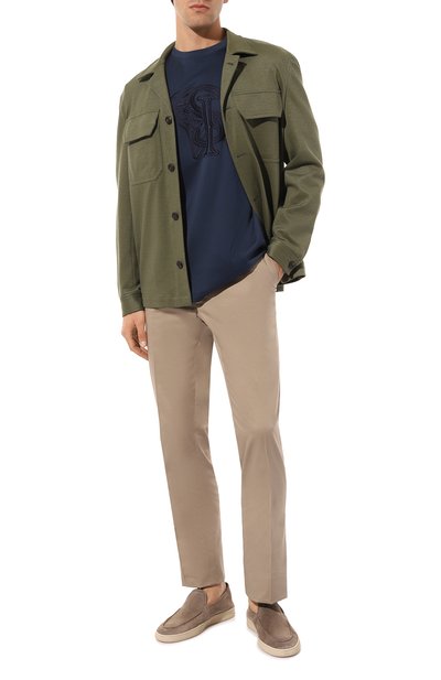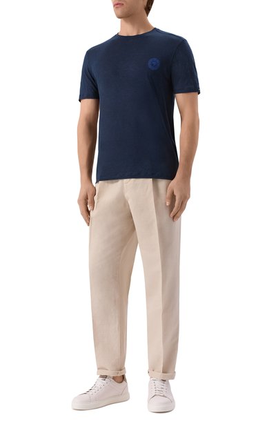 Темно-синюю футболку выполнили из шелковистого хлопкового джерси, изготовленного из длинноволокнистого сырья премиального качества. Материал получился особенно приятным на ощупь и при этом прочным. Спереди модель украсили знаковой монограммой, в которую вписали изображение фирменного орла. Узор вышили нитями в тон.
