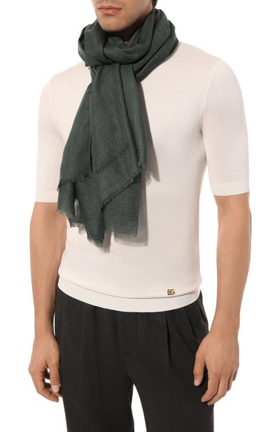 Широкий салатовый шарф с короткой бахромой по краям выполнен из тонкой смесовой ткани с фуляровыми жаккардовыми узорами-монограммами. Полушерстяной материал с добавлением хлопка и шелка хорошо пропускает воздух и сохраняет тепло, обеспечивая комфорт в переменчивую погоду. Аксессуар, длины которого хватит, чтобы несколько раз обернуть шею, почти не ощущается на теле.