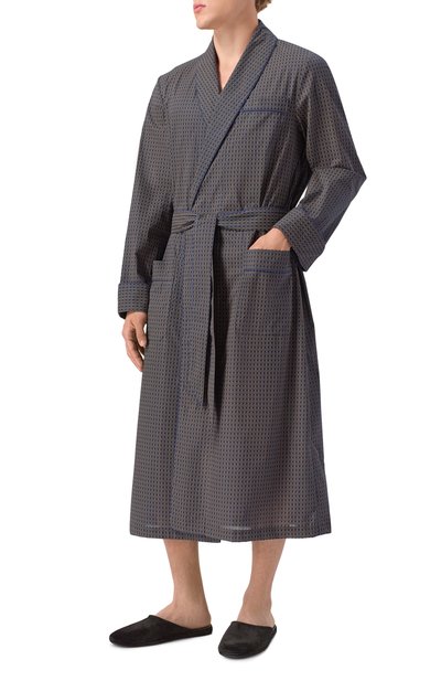 Темно-синий халат с широким шалевым воротником сшили вручную из тонкой ткани, для производства которой использовали отборный египетский хлопок. Его длинные волокна мягче, прочнее и эластичнее обычного, а в гладкости не уступают шелку, поэтому модель получилась дышащей и особенно приятной на ощупь. Изделие дополнили поясом-лентой.