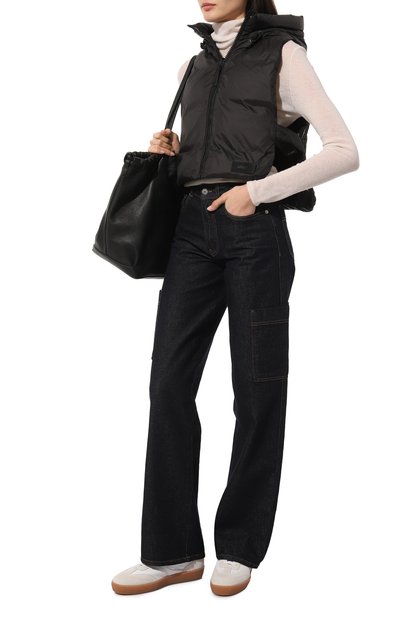 Двусторонний жилет цвета хаки слегка укоротили и заменили боковые швы широким ремешками. Для его изготовления использовали матовый и глянцевый полиэстер, пропитанный водоотталкивающим составом. Блестящую сторону простегали и дополнили спинку логотипом бренда и надписью This garment is reversible, а матовую оставили гладкой и нашили спереди черный фирменный патч. Модель утеплили почти невесомыми утиными пухом и пером.