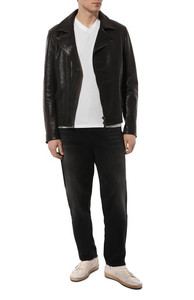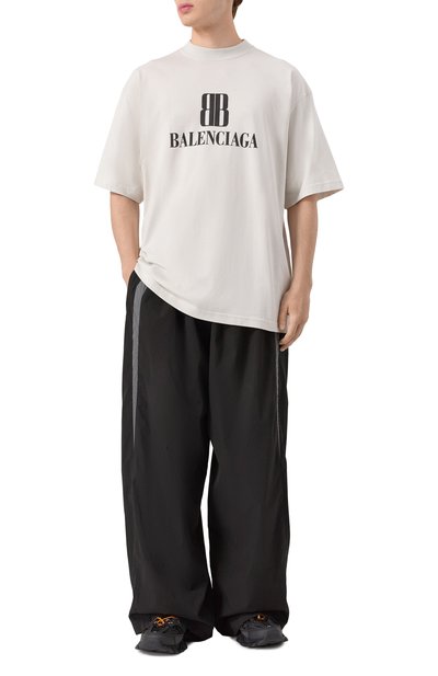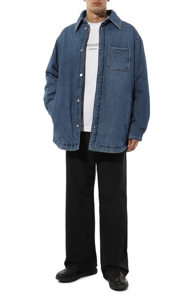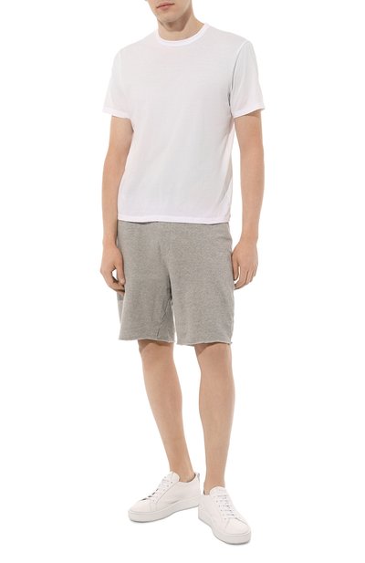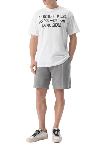 Белую свободную футболку со слегка спущенной линией плеч и короткими рукавами сшили из тонкого дышащего джерси. Материал, связанный из отборных хлопковых волокон, получился шелковистым на ощупь, прочным и при этом легким. Принадлежность модели марке обозначили черным небольшим логотипом на груди.