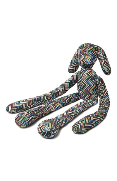 Игрушку в форме зайца сшили из фигурных деталей, которые выкроили из мягкой хлопковой ткани с разноцветным шевронным узором. Приятный на ощупь прочный материал почти ничего не весит и не требует сложного ухода. Модель не деформируется за счет упругого гипоаллергенного наполнителя.