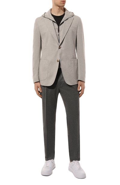 Серые брюки в широкую полоску, вертикаль которой поддерживают стрелки, выполнили из плотной шерсти премиального качества. Ткань, изготовленная из гибких волокон, практически не мнется, поэтому изделие долго выглядит безупречно. Нам нравится сочетать такую модель с белым джемпером и черными дерби.