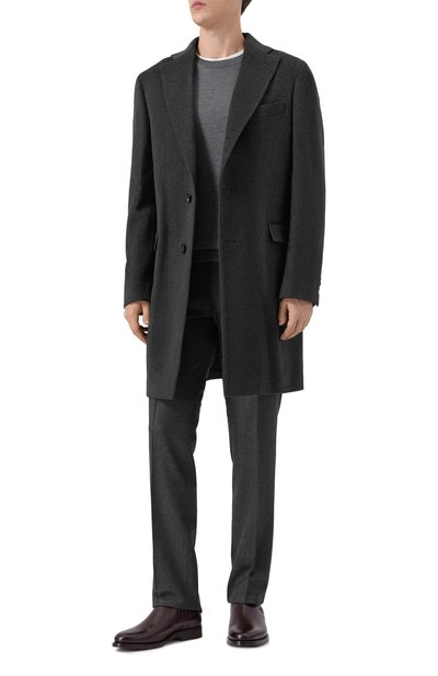 Серые брюки в широкую полоску, вертикаль которой поддерживают стрелки, выполнили из плотной шерсти премиального качества. Ткань, изготовленная из гибких волокон, практически не мнется, поэтому издели е долго выглядит безупречно. Нам нравится сочетать такую модель с белым джемпером и черными дерби.