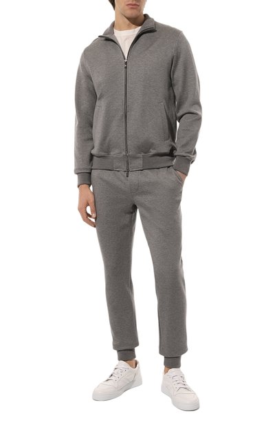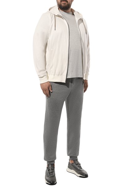 Базовые серые брюки сделали похожими на джоггеры, дополнив пояс эластичными боковыми вставками и кулиской. Сходство усиливает широкая резинка внизу, которая формирует манжеты сзади, а карман на правой брючине отсылает к карго. Неизменными остались зауженный крой и мягкая ворсовая фланель из чистой шерсти.