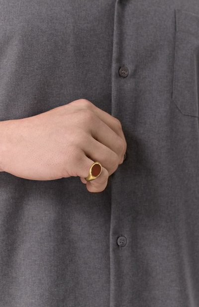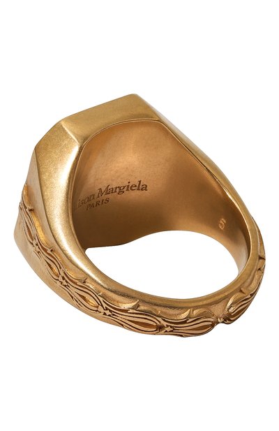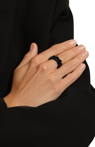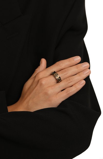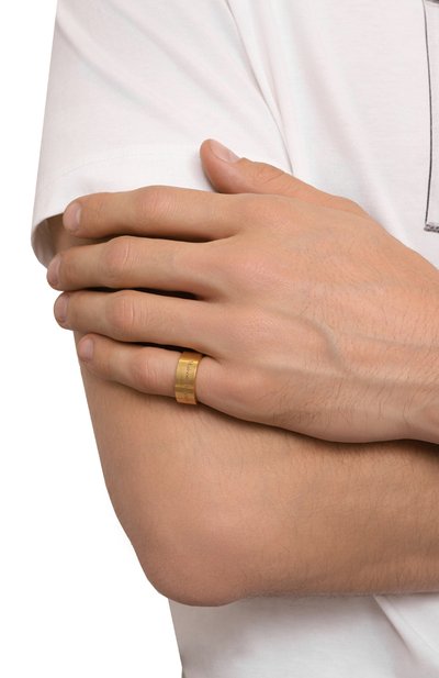 Небольшое незамкнутое кольцо напоминает сувенир из археологической экспедиции. Такой эффект создают оттенок античной бронзы, декор в виде знаковых для марки черепов и тисненый логотип, подчеркнутый чернением. Для изготовления аксессуара использовали легкую латунь с гальваническим покрытием золотом.
