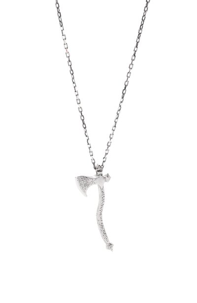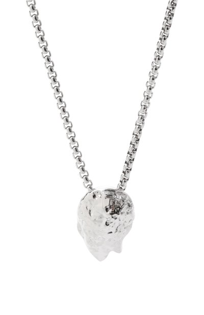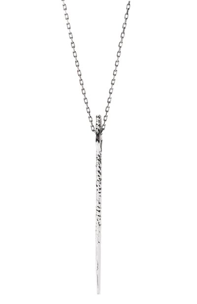 Прямоугольный кулон декорировали выгравированным крупным логотипом, выполненным в стиле граффити. Аксессуар закрепили на ажурной тонкой цепочке, длину которой можно регулировать при помощи дополнительных звеньев с подвеской-эмблемой. Для изготовления модели использовали полированный ювелирный сплав с гальваническим покрытием из серебра.