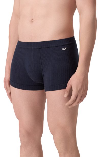 Для изготовления чернильно-синих боксеров использовали дышащий хлопковый трикотаж с добавлением стрейчевых волокон. Материал легко тянется, но не вытягивается, поэтому трусы комфортно облегают фигуру, а благодаря анатомической конструкции не сдавливают. Широкий пояс-резинку украсили контрастной полосой с жаккардовым логотипом.