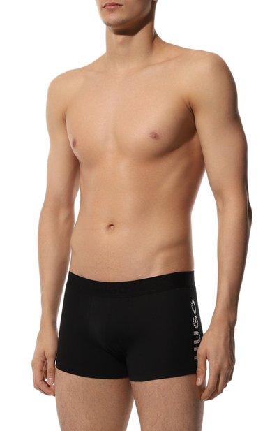 Черные боксеры выполнили из мягкого хлопкового трикотажа с добавлением эластичных волокон. Трусы из такого приятного на ощупь материала не раздражают кожу и хорошо пропускают воздух, а благодаря анатомическому крою комфортно облегают, не сдавливая. Широкий пояс-резинку украсили крупным жаккардовым логотипом в тон.