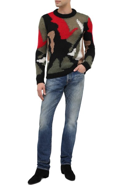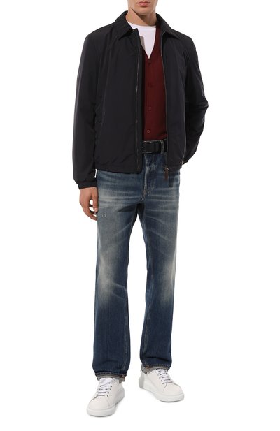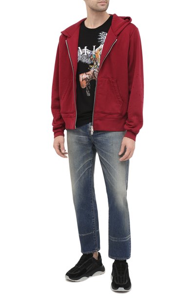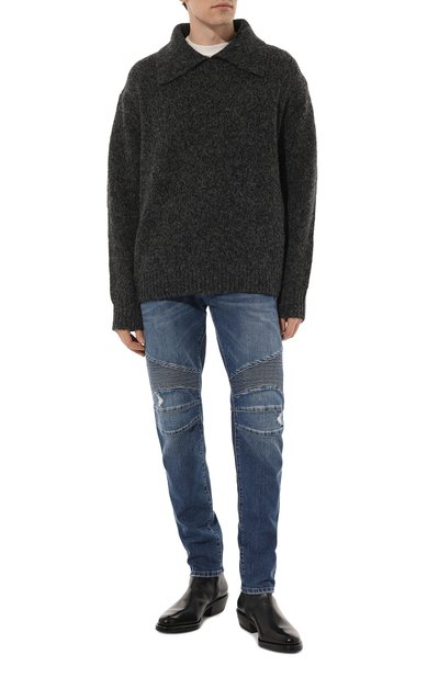 Зауженные джинсы с классической посадкой сшиты из эластичного хлопка, поэтому не сковывают движения. На ткани сформировали потертости и заломы, чтобы синий цвет поблек и стал неоднородным, а модель приобрела винтажный вид. Задний карман украсили узкой металлической пластиной с выгравированным логотипом марки, основанной Пьером Бальманом.