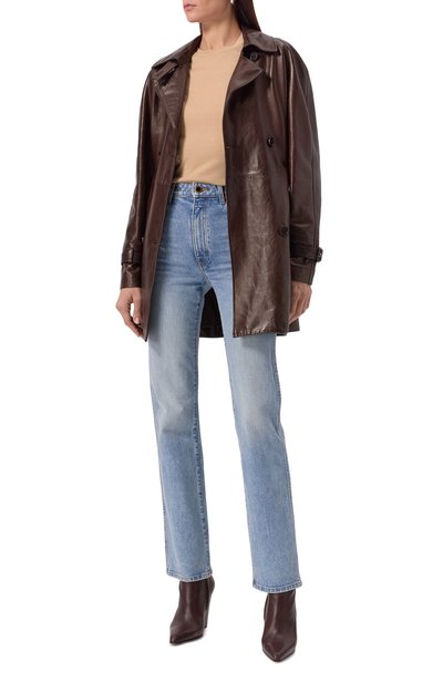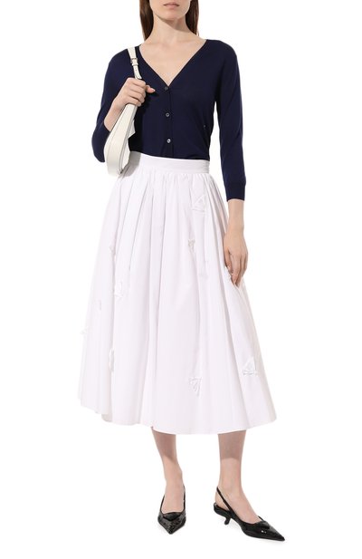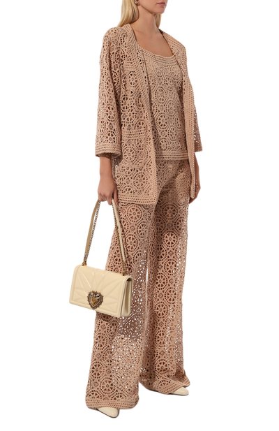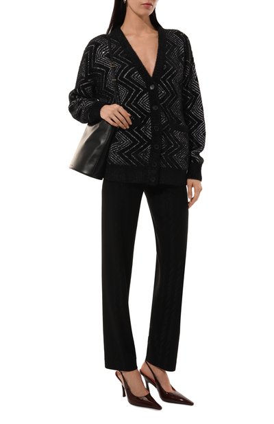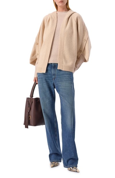 Длинный кардиган с большими накладными карманами по бокам выполнили из чистого кашемира. Модель украсили брендированным медальоном, разместив его на левом укороченном рукаве.
