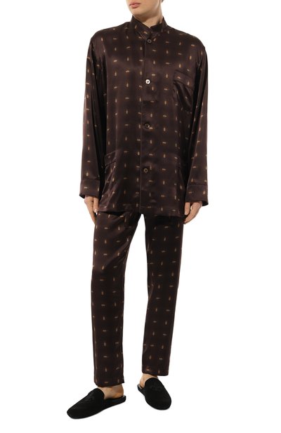 Для пошива темно-коричневой рубашки с длинными рукавами использовали особенно легкий и мягкий хлопок с вертикальным мотивом, напоминающим канаты с узлами. В изделии из такого дышащего, шелковистого на ощупь материала будет максимально комфортно во время сна или отдыха.