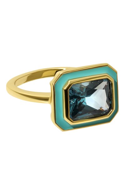Кольцо, изготовленное вручную из гипоаллергенного ювелирного сплава, покрыто тонким слоем желтого золота. Крупное, но при этом легкое украшение инкрустировано кубическим цирконом искусной огранки. Глубокий лазурный оттенок сверкающего камня поддерживает эмалевая бирюзовая отделка.