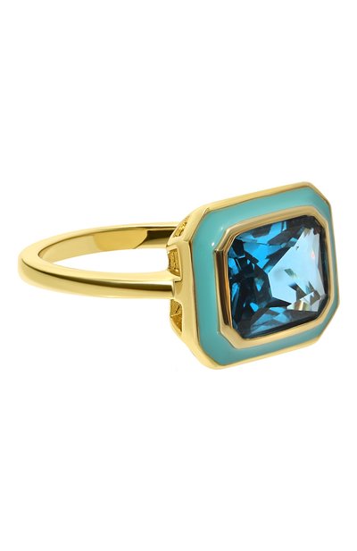 Для изготовления кольца использовали ювелирный сплав с гальваническим покрытием золотом. В рельефном касте с ажурным основанием закрепили полупрозрачный кубический цирконий, грани которого ловят и многократно множат даже приглушенные лучи света. Глубину синего оттенка камня усилили бирюзовой эмалью, нанесенной вручную на узкий обод.