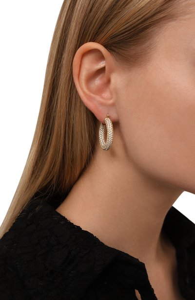 Небольшие серьги-кольца скульптурной формы усыпанными белыми кубическими цирк ониями. Паве чередуется с гладким позолоченным металлом, создавая игру цветов и фактур. Украшение застегивается замком из гипоаллергенной медицинской стали.