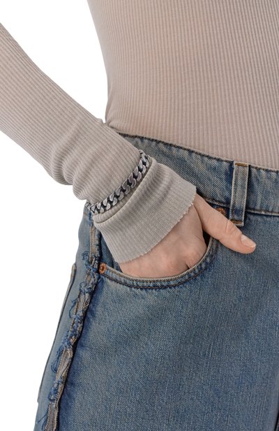 Этот широкий браслет словно собрали из трех тонких обручей, объединенных кольцом. На нем закрепили прямоугольную пластину с выгравированным цифровым кодом, обозначив принадлежность бренду. Для изготовления модели использовали прочный ювелирный сплав с сияющим гальваническим покрытием из серебра.