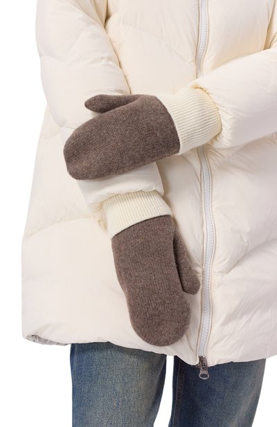Для изготовления бежевых меланжевых перчаток использовали мягкую кашемировую пряжу, укрепленную шелковыми волокнами. Материал особенно приятно ощущается на коже и формирует оптимальный микроклимат как в морозы, так и в оттепель. Основную часть аксессуара с широким отворотом выполнили фактурной вязкой, а пальцы — гладкой.