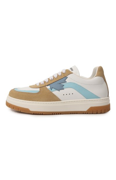 Для создания кедов с широкой резиновой подошвой использовали комбинацию белой гладкой кожи, серой бархатистой замши и синего фактурного полимера. Пару с перфорацией по бокам украсили крупной алой аппликацией в форме кленового листа, с которой перекликается белый принт на заднике.