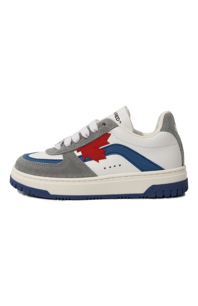 Для создания кедов с широкой резиновой подошвой использовали комбинацию белой гладкой кожи, серой бархатистой замши и синего фактурного полимера. Пару с перфорацией по бокам украсили крупной алой аппликацией в форме кленового листа, с кот орой перекликается белый принт на заднике.