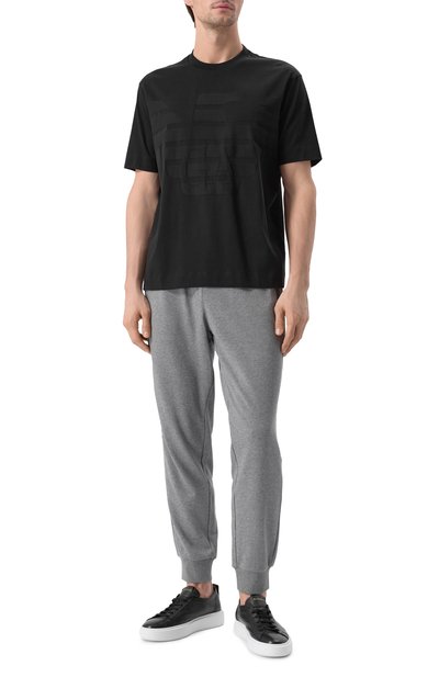Футболку с круглым вырезом выполнили из тонкого льняного джерси. Изделие окрасили уже в готовом виде со смягчающим составом, что сделало его особенно приятным на ощупь.