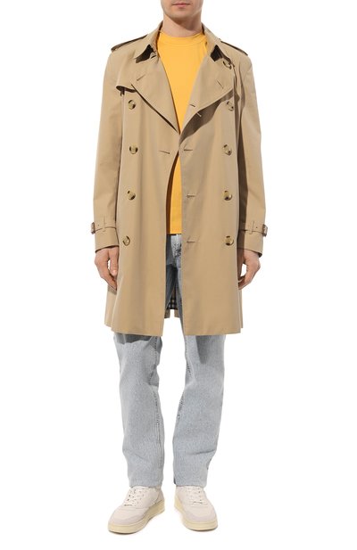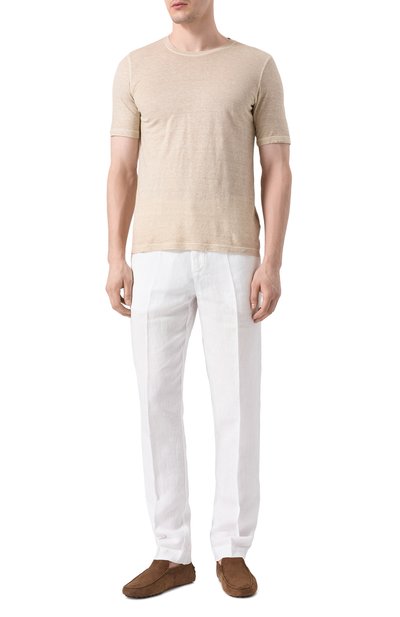 Футболку с круглым вырезом выполнили из тонкого льняного джерси. Изделие окрасили уже в готовом виде со смягчающим составом, что сделало его особенно приятным на ощупь.