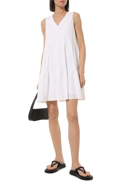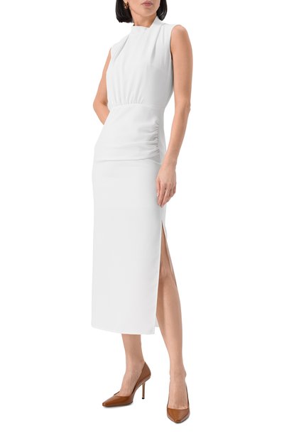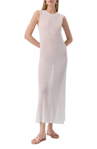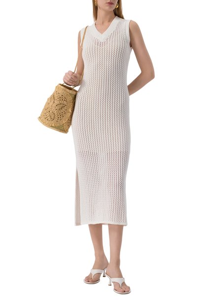Белое однотонное миди-платье без рукавов словно создано для жаркой погоды. Модель с высокими разрезами по бокам и короткой пуговичной планкой под круглой горловиной сшили из ультратонкого легкого льна. Прочный материал поддерживает оптимальный микроклимат, хорошо пропускает воздух и от водит от тела лишнюю влагу.