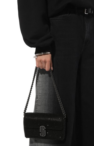 Серебристая сумка The Shoulder Bag — идеальный завершающий штрих комплекта для светского мероприятия. Марк Джейкобс поместил аксессуар из прочного текстиля в металлический чехол-сетку со множеством прозрачных кристаллов. Их блеску вторят фирменная накладка на откидном клапане и плечевой ремень-цепочка. Внутрь хватит места для картхолдера, смартфона, очков.